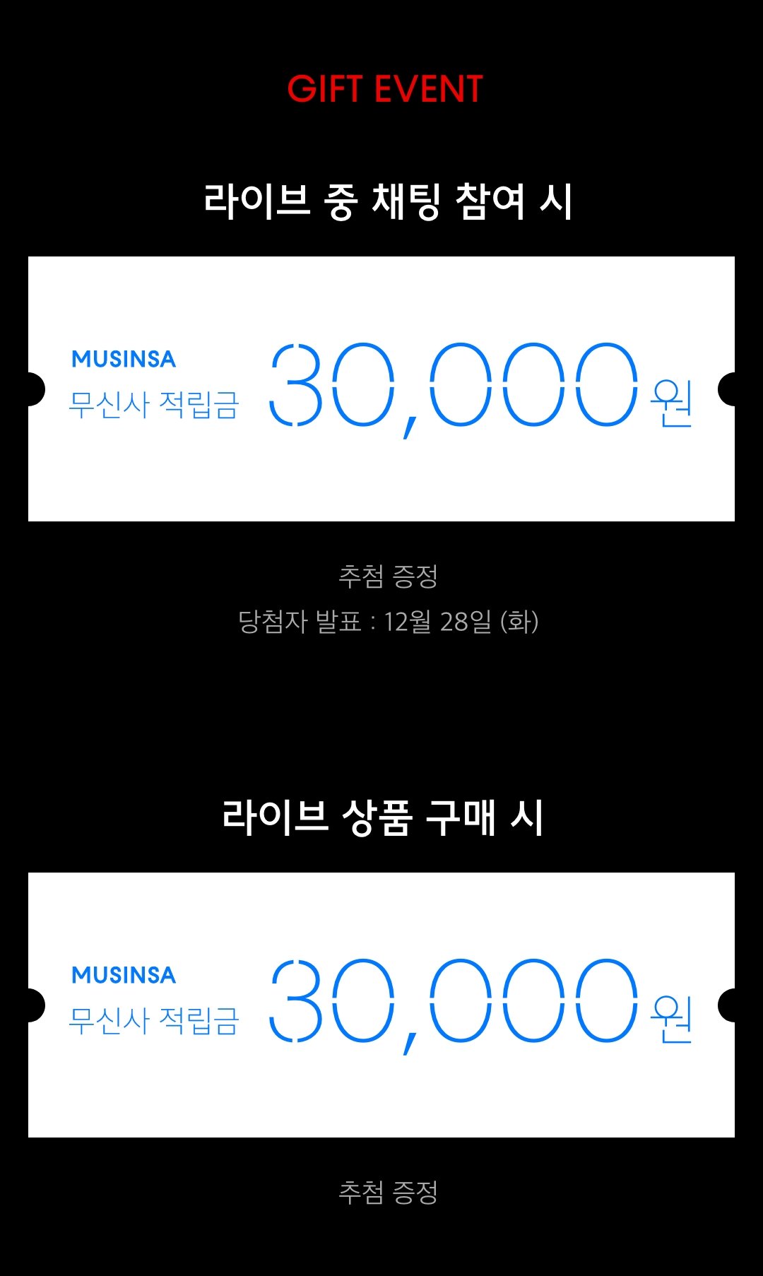 - 12월 27일 방송 중 라이브 상품을 구매한 고객에 한하여 추첨을 통해 무신사 적립금 3만 원이 지급됩니다. (방송 종료 후 구매 건 해당 없음)